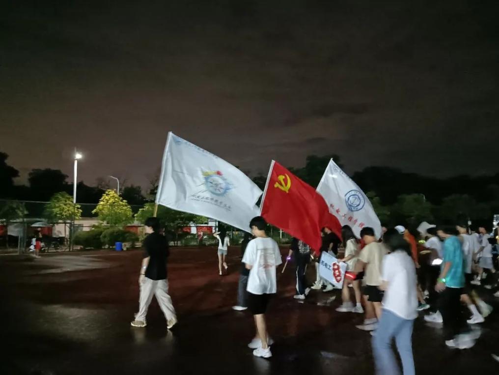 在路灯的余辉下,参赛者在校园内穿梭,荧光手环随着摆臂在手中摇晃着,远看犹如一颗颗五彩斑斓的光点,汇聚成一条炫彩夺目、快速流动的河流。工作人员挥舞着党旗及院旗,为参赛成员加油助威,并在相应打卡点为其加油打气,参赛者激情澎湃,全力奔向终点。